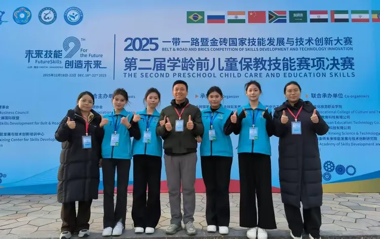近日,2025一带一路暨金砖国家技能发展与技术创新大赛第二届学龄前儿童保教技能赛项决赛在山东烟台文化旅游职业学院圆满落幕。我校两支参赛队伍凭借扎实过硬专业基础与良好团队协作能力,与来自全国76支参赛队同台竞技,在激烈的角逐中,崭露头角,勇创佳绩。艺术师范系幼儿保育专业2024级学生张欣怡、刘雨馨以排名第二的成绩斩获金奖,并将代表中国参加2026年上半年“一带一路金砖国”技能发展与创新大赛总决赛;景一帆、王博华荣获铜奖;李妮、孙攀攀两位老师获得“优秀指导教师奖”,同时学校校荣获“最佳组织奖”的荣誉。